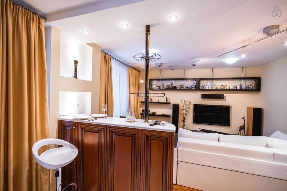 • ✨ Совмещенная гостиная-кухня с диваном, обеденной зоной и барной стойкой, спальня с большой кроватью, полностью оборудованная кухня (посудомойка, кофемашина!), ванная с ванной.