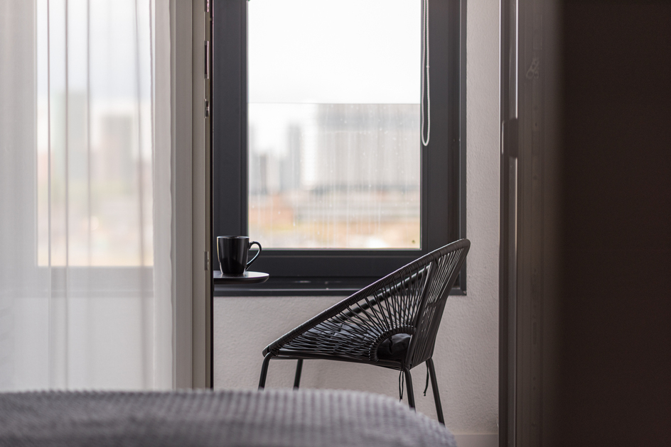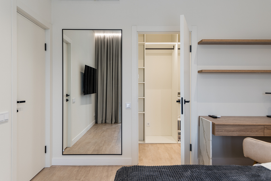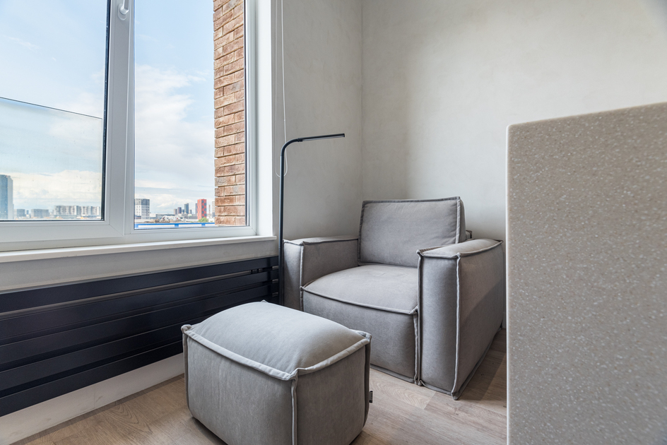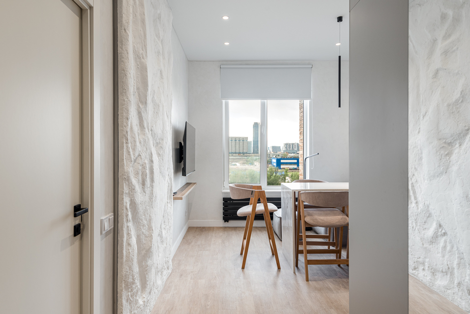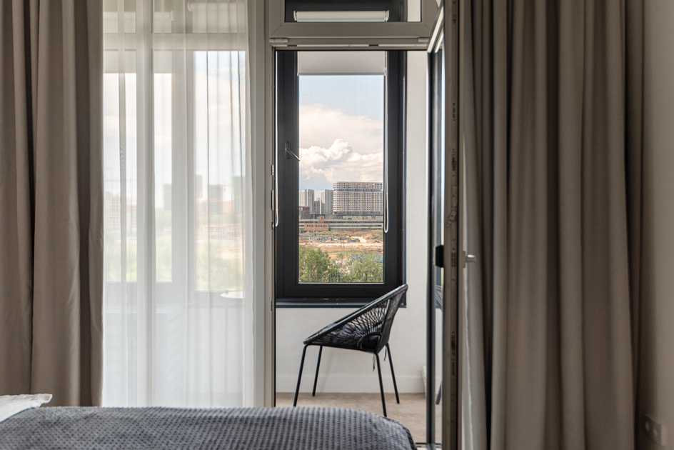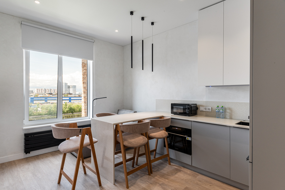 Светлая, уютная квартира с панорамными окнами и дизайнерской отделкой. Пространство зонировано: спальня, кухня, рабочая зона. Спокойные оттенки, натуральные материалы и мягкое освещение создают атмосферу уюта и комфорта.