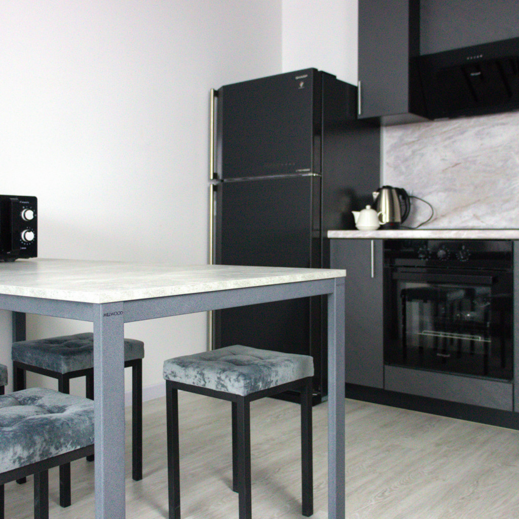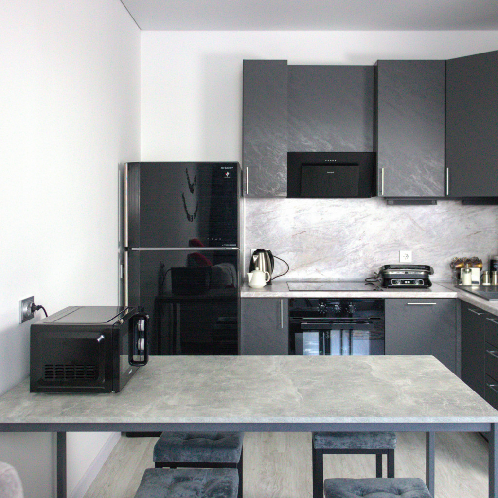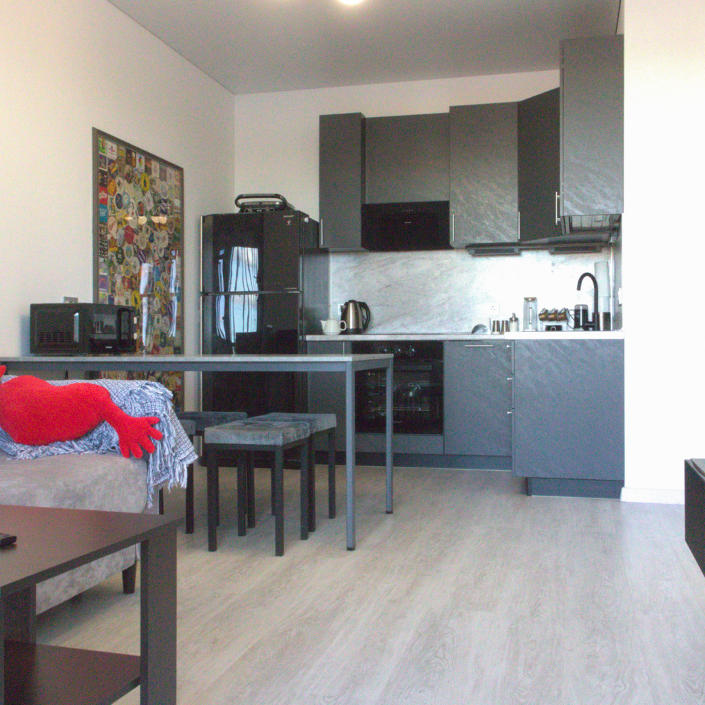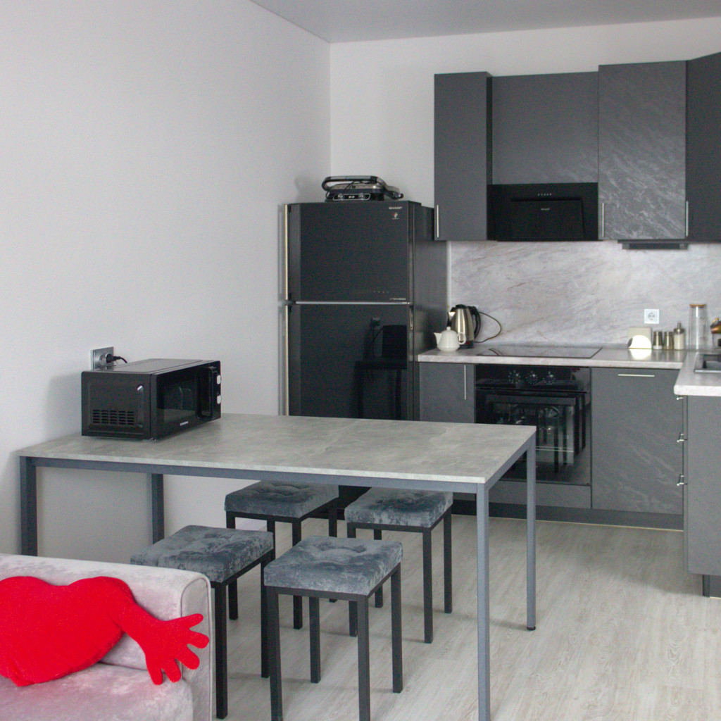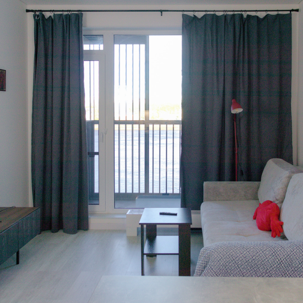В апартаментах могут разместиться до 6 гостей. Для отдыха предусмотрены две отдельные спальни с двуспальными кроватями и рабочим местом у окна с видом на набережную. Просторная кухня-гостиная объединяет обеденную зону, диван-кровать и телевизор. Кухонное пространство полностью оборудовано: варочная панель, духовой шкаф, холодильник, микроволновая печь, чайник, посудомоечная машина и все необходимые принадлежности для приготовления еды.
