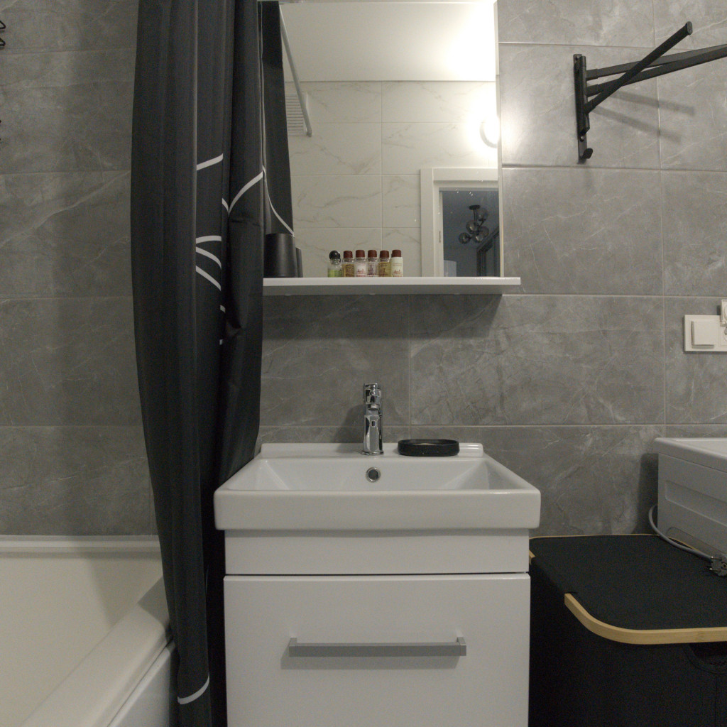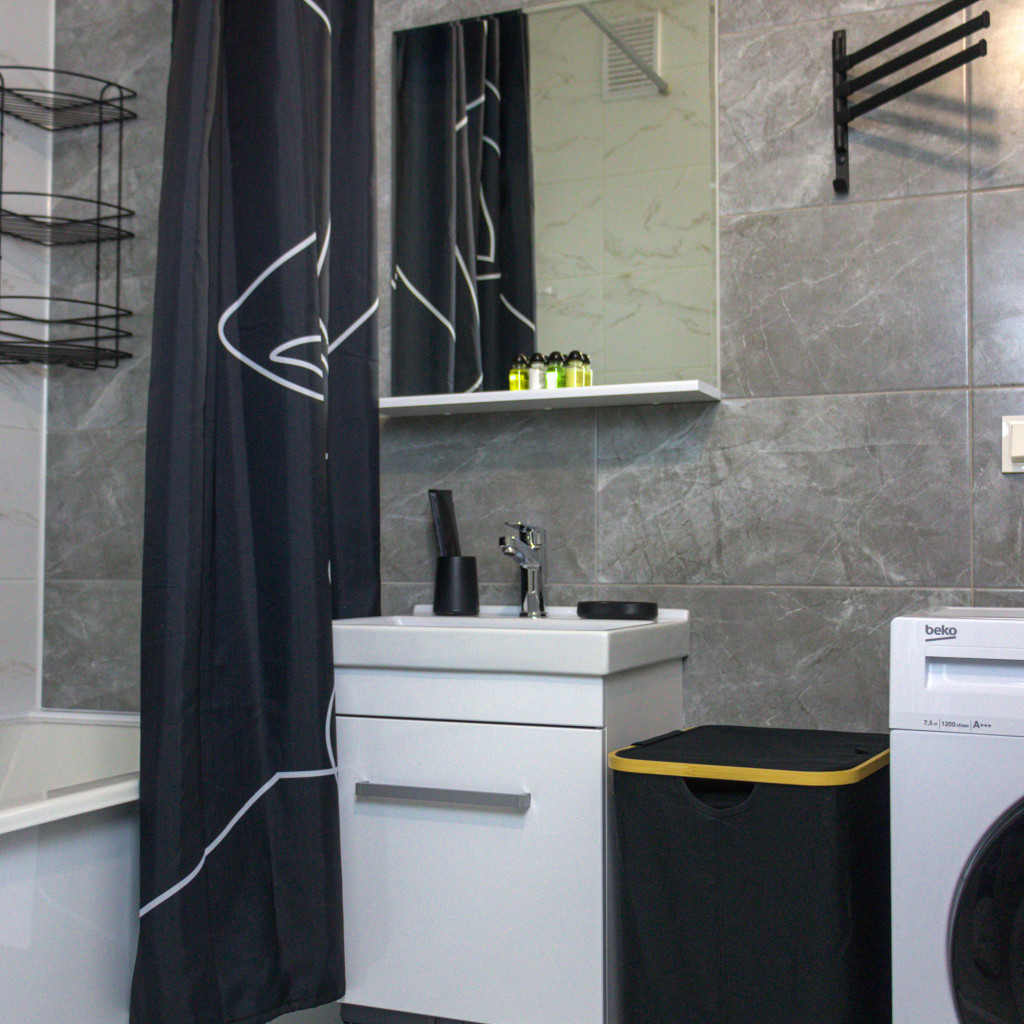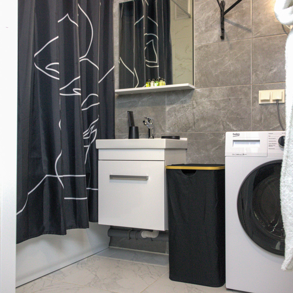 Современный санузел с ванной укомплектован стиральной машиной, полотенцами и фирменными косметическими наборами Flat Inn. Для удобства гостей предусмотрены Wi-Fi и вместительные системы хранения.
