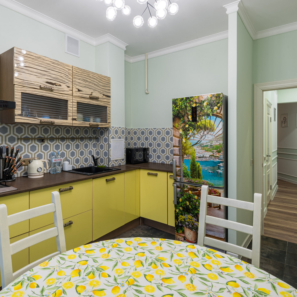 Гостиная с удобным диваном, обеденной зоной и ТВ. Полностью оборудованная кухня: варочная панель, духовой шкаф, холодильник, чайник, посуда. Просторная спальня с большой кроватью и системой хранения.